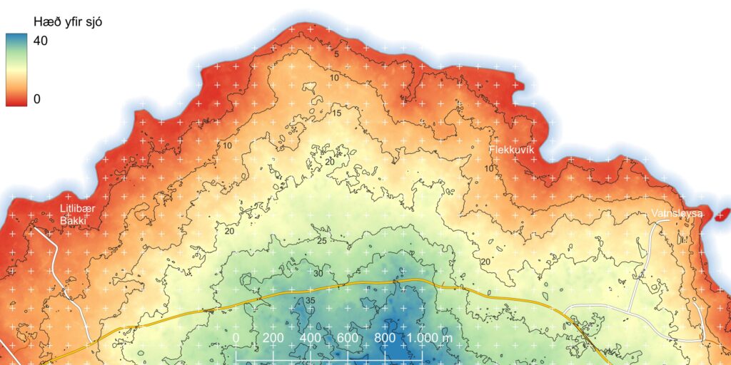 Vatnsleysustrandarvegur fer hæst í um 35 metra hæð þar sem hann liggur yfir Keilisnes en frá þeim stað eru 1.000-1.500 metrar til sjávar. Jafnaðarhalli er því 2,3%-3,5%. Nesið er þríhyrningslaga og í grófum dráttum liggja hæðarlínur samsíða ströndinni hvoru megin. Dálítill hryggur liggur eftir nesinu miðju og þar eru hraunkollar einna stórskornastir. Á stöku stað teygja lágsvæðin sig inn eftir nesinu og mynda nokkurs konar ,,dali''. Við afmörkun iðnaðarsvæða á nesinu þarf að hafa í huga hvort landslagið megi nýta til að minnka sýnileika mannvirkja. Búast má við að lóðir séu lækkaðar í landinu um leið og þær eru jafnaðar en hæðin þarf þó að vera næg til að tryggja gott afrennsli. Grjót úr skeringum í hraunið má nýta við mannvirkjagerð á svæðinu og laus jarðefni af yfirborði mætti nýta í manir.